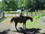 Giselle, successfully saddled on Jesse. The ears of Bill's horse, Danny, are in the foreground.