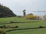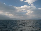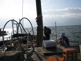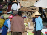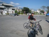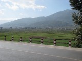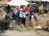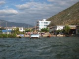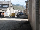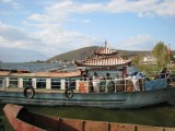 We rented mountain bikes from our inn and set out for a day's ride around Erhai Lake. Once we got far enough away from town we were able to get off the main road. We then found ourselves on dirt roads winding through very small villages. Most people ignored us but were very friendly if we would stop to ask which way to go. It was a great ride around the lake to Wase, where a regional market is held for area farmers every Friday. We were used to being the only foreigners around, but here we were the only outsiders of any kind--everyone else was from neighboring villages and had come to buy or sell food, clothing, cooking supplies, or various other items. We bought a snack but there wasn't much else for us to buy at the market--we just soaked in the scene and enjoyed ourselves. It was unlike anywhere else we had been. The entire town was jammed with people, tables, and wares. We were planning to take a ferry from Wase back to Caicun, which is about a 5 minute ride back to Dali. The tourbooks assured us that a ferry runs from Wase to Caicun until evening. Our innkeeper, who is also a guide and knowledgable about the area, told us it would be "no problem" to get the ferry to Caicun. But when we got to Wase we heard the phrase "mei you" for the first time in China, which means "no have." We're not sure if the ferry stopped running altogether, or just on that particular day, but it rapidly became clear that there was no ferry to Caicun for us. By this time it was too late for us to have any chance of riding the rest of the way around the lake before dark and we were also getting a bit tired. So we took a ferry across the lake to Xizhou, which is about 15 km north of Dali. The ferry operators "scammed" us by charging us about $2.50 each instead of about $1, but at that point we were just happy to be heading in the right direction and rationalized that we had big bikes that we wanted to get safely across the water. It got a bit embarrassing when the ferry operator went around and pretended to collect the higher fare from other patrons, some of whom played along and some of whom refused. Everyone else on the ferry lived in Xizhou and was either coming home from shopping at the market or from selling various items. Many of the other people had large baskets filled with food or other items. One woman even walked up the gangplank with a full-sized desk tied onto her back! We successfully made it across the water, the ferry driver carried our bikes down the gangplank for us because we apparently looked a little wobbly. We got on our bikes around 5:30pm as the sun was getting ready to set. A friendly dentist we had met on the ferry caught up to us on our bikes and helped us navigate to the main road from the town's small port. First we had to carry our bikes over fresh-poured concrete because they were repaving a road, then we had to scramble over an enormous pile of debris that the pavers had put further down the road (so cars wouldn't plow into the freshly poured concrete, i guess). Finally we got to the main road and zipped along for a while. Bill was in the lead and Giselle started despairing and even got a bit whiny about how adversity was about to overcome us. Bill tried in vain to reassure Giselle that it would be ok but she was about ready to steer her bike over the side of the road and sleep in a farmer's field for the night when, on the horizon, she noticed the three San Ta Pagodas which meant that we were approaching Dali. At that point, Giselle knew that we could make it to Dali, but Bill began to despair because it had been so much work trying to reassure Giselle. So Giselle began to reassure Bill that we could make it. And, sure enough, we did. We reached the north gate of Dali just as the last bit of sunlight disappeared. We stopped for a few minutes, caught our breath, and then walked through town back to our inn for hot showers and hot tibetan goulash. All told, we rode about 70km. It was a long day that didn't go exactly as we had planned but it was one of the most amazing days of our trip and one of the best adventures we've ever had.