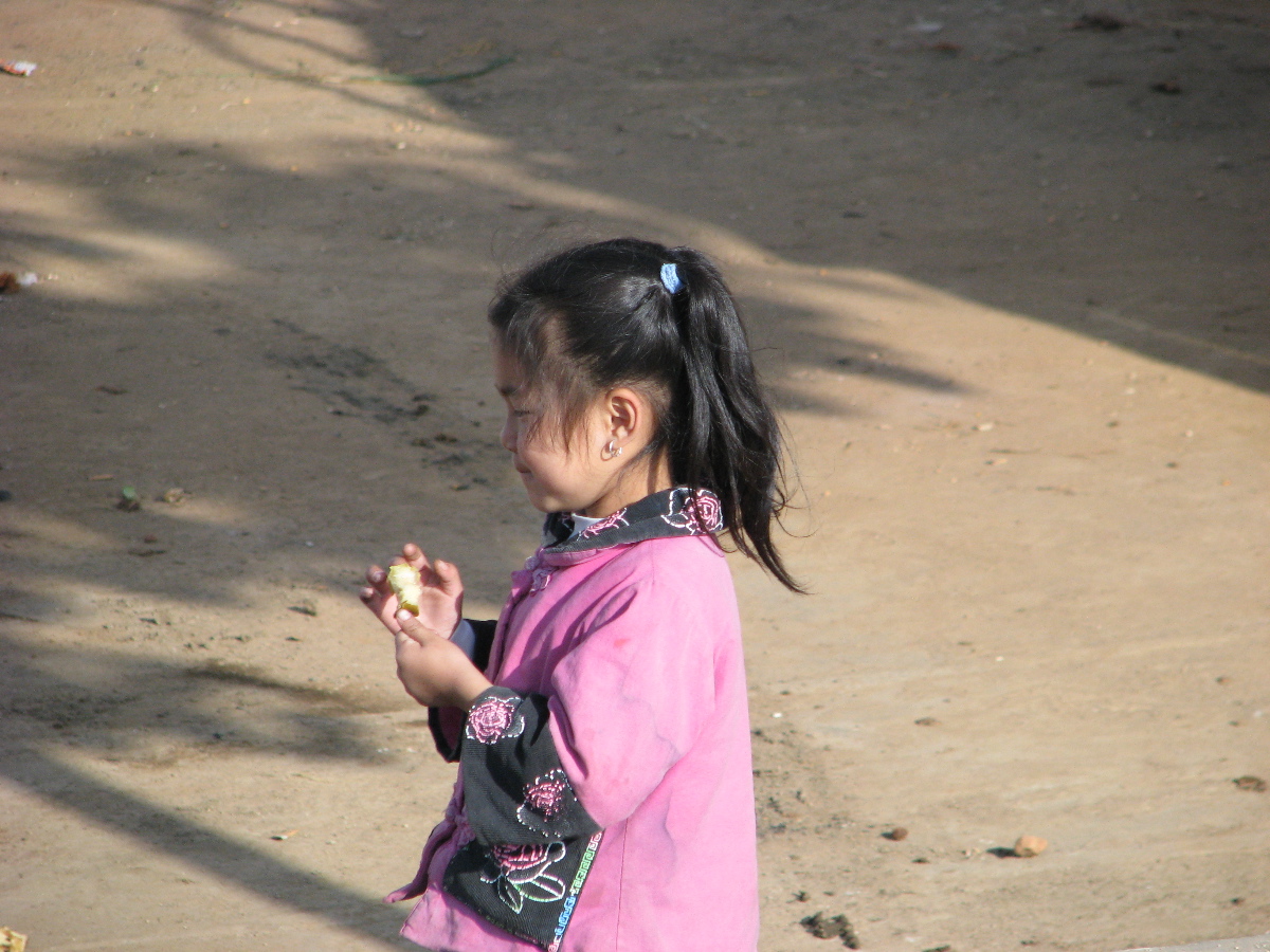 A young girl played and had a snack near the port.