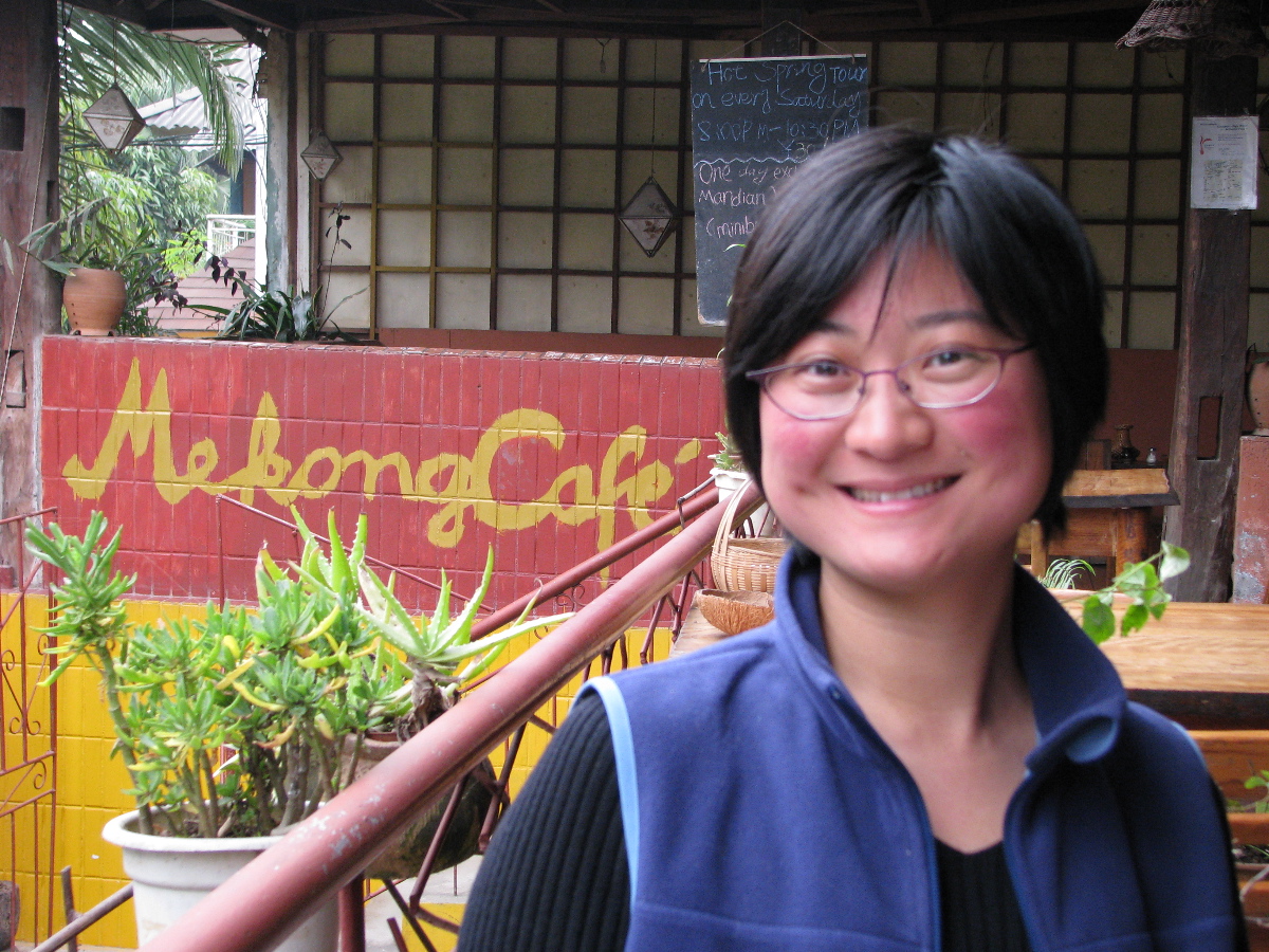 Giselle at the Mekong Cafe, a great place that caters to westerners' morning needs. (coffee, eggs, no chili peppers, etc)